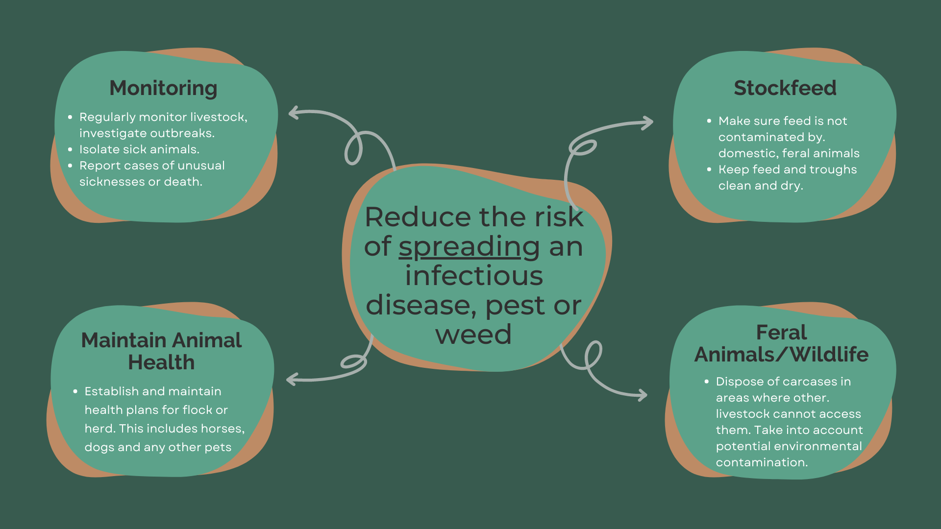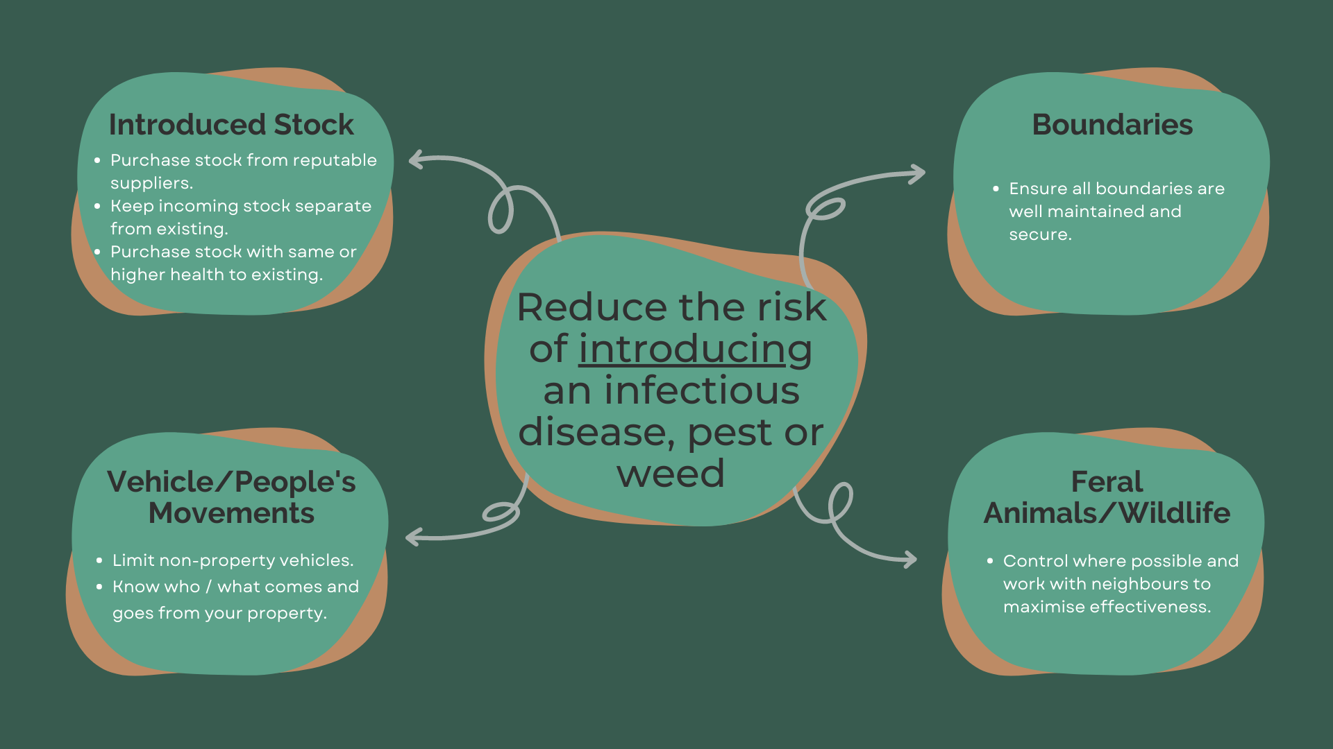 Farm biosecurity is a set of measures designed to protect a property from the entering, emerging, establishing, and spreading of pests, diseases, and weeds. It’s the management of risks to the economy, the environment, and the community. Biosecurity can be implemented off-shore, at the border and on-farm.